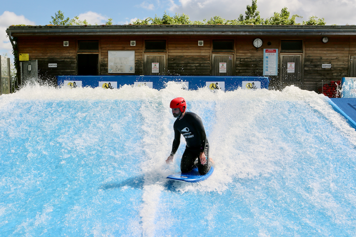 Ici, nul besoin de regarder les horaires des marées. Juste les horaires d’ouverture. Mais comment donc fait-on pousser une vague si loin de l’océan ? Une question qui a de quoi vous plonger dans des abîmes de perplexité. Les ingrédients sont les suivants : prenez une bâche bien tendue et inclinée en forme de toboggan sur laquelle vous projetez de l’eau à forte puissance. Vous obtenez une vague statique qui permet de glisser et de faire des figures.