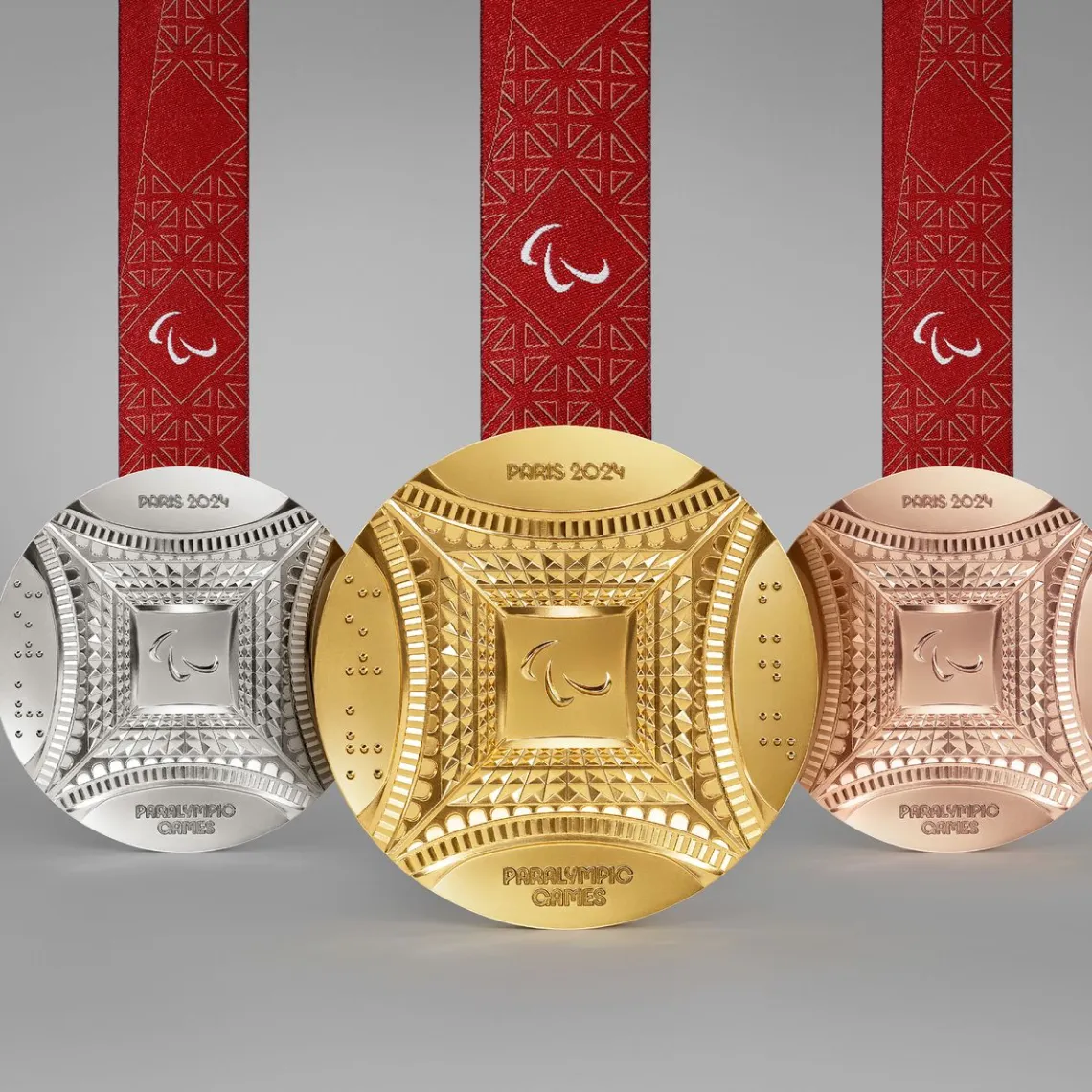Pour les médailles paralympiques, soumises à moins de contraintes de création, le revers présente une fois encore la Tour Eiffel, mais vue par en dessous. Les mots « Paris » et « 2024 » y sont inscrits en braille universel.