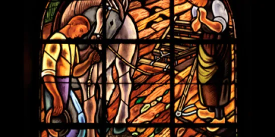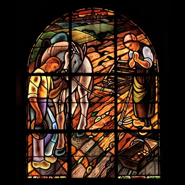 Les quatorze verrières de l’église sont l’œuvre de Joseph Guével, maître verrier à Noisy-le-Sec. Elles sont les copies, posées à la Libération, d’une série réalisée juste avant la Seconde Guerre mondiale et totalement détruite lors de bombardements en 1944. Réalisées dans un style naïf, elles font référence à la vie des fidèles et plus largement aux Romainvillois. Sur fond de champs labourés sont figurés des figures marquantes de l’histoire de la paroisse (l’Abbé Houël et les sœurs de la Providence) et les sacrements de l’Eglise catholique (baptême, communion, mariage, eucharistie). On remarque ainsi la reprise du thème, récurrent à l’époque, de l’Angelus de Millet ainsi que le recours aux images traditionnelles de l’iconographie chrétienne, comme celle du Bon pasteur.