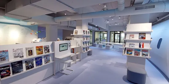 Accessible aux visiteurs munis d’un billet d’entrée pour le Musée de l’Air et de l’Espace, l'espace médiathèque-ludothèque compte :