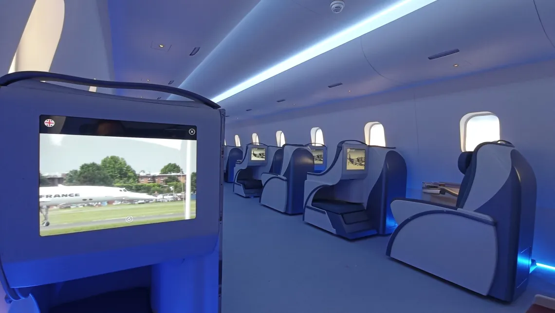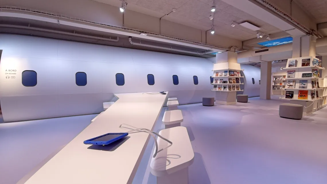 - 1 espace « à bord » recréant le cockpit d’un Airbus A380 où les visiteurs pourront consulter des documents audiovisuels sur l’aéronautique, l’espace et les voyages,
