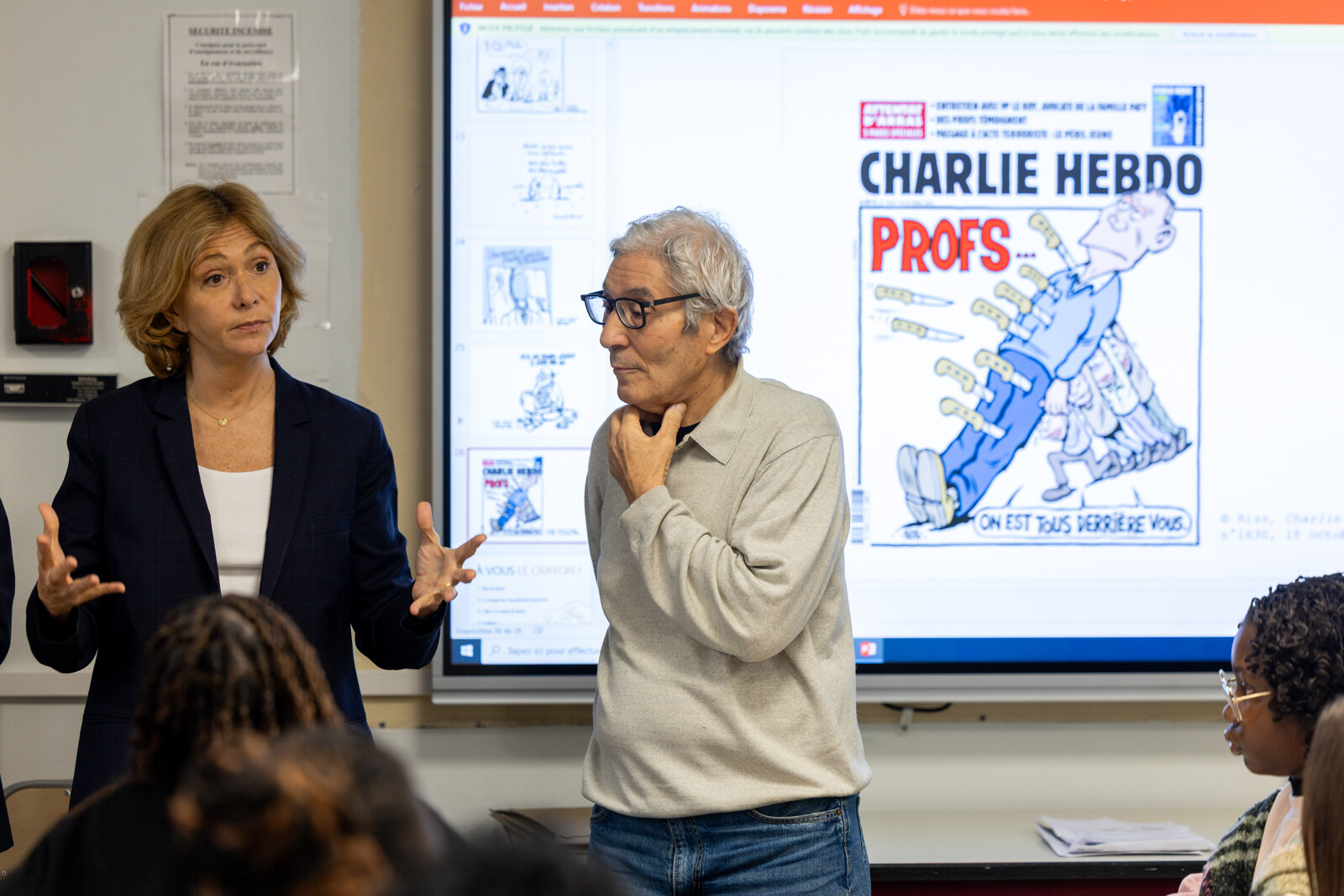 Lorsque les élèves passent tour à tour au tableau pour présenter l'une des caricatures qui les a plus marqués, Valérie Pécresse intervient régulièrement, apportant des précisions juridiques, rappelant l'importance de la laïcité et des valeurs républicaines.