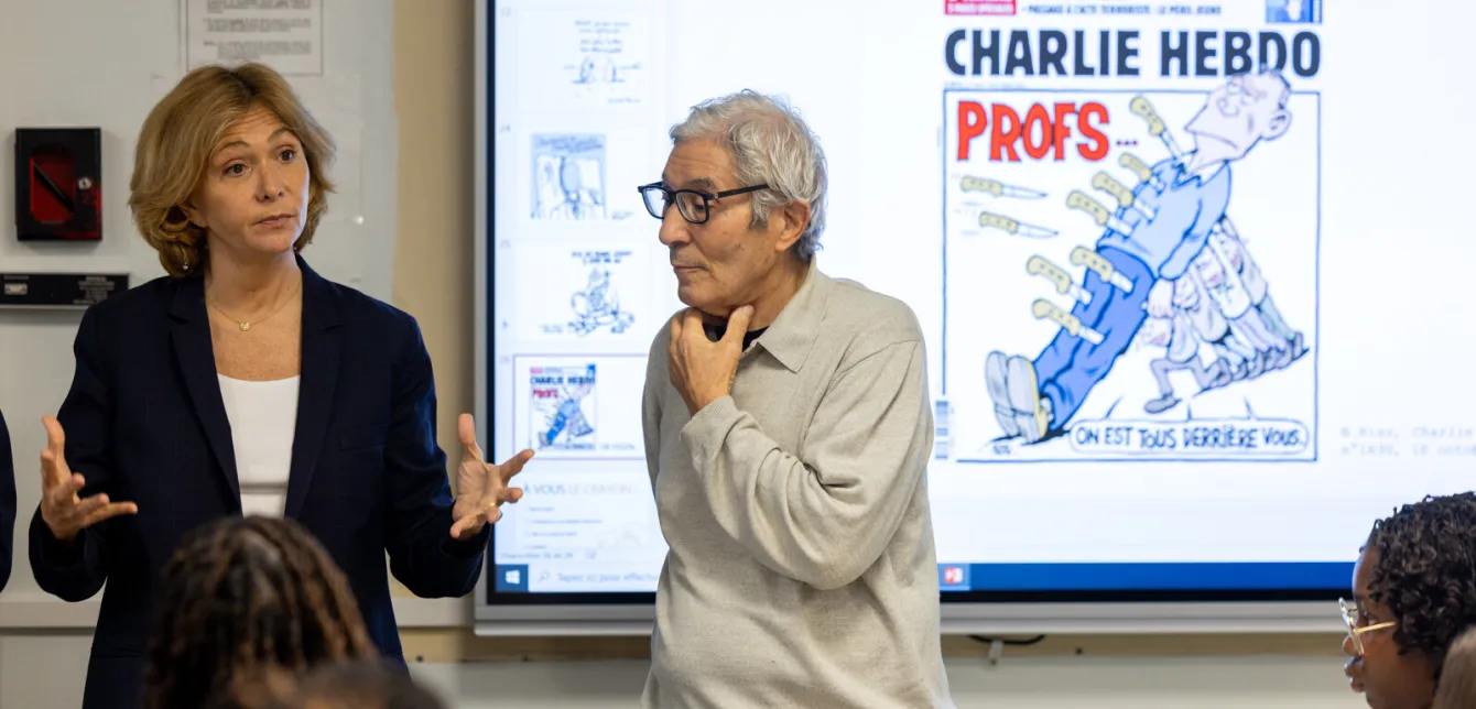 15 heures, ce jeudi 5 février 2026. Le brouhaha habituel de fin de journée règne dans les couloirs du lycée Edgar Quinet, rue des Martyrs, dans le 9ᵉ arrondissement de Paris. Mais dans la salle de classe 51 de l'établissement parisien, l'ambiance est différente. Une quarantaine de lycéens de seconde prennent place, carnets à la main. Ils savent qu'ils vont rencontrer Boualem Sansal, mais aussi Valérie Pécresse, la Présidente de la Région, à l’occasion de la 2e édition du programme Caricature et démocratie de la Région Île-de-France.