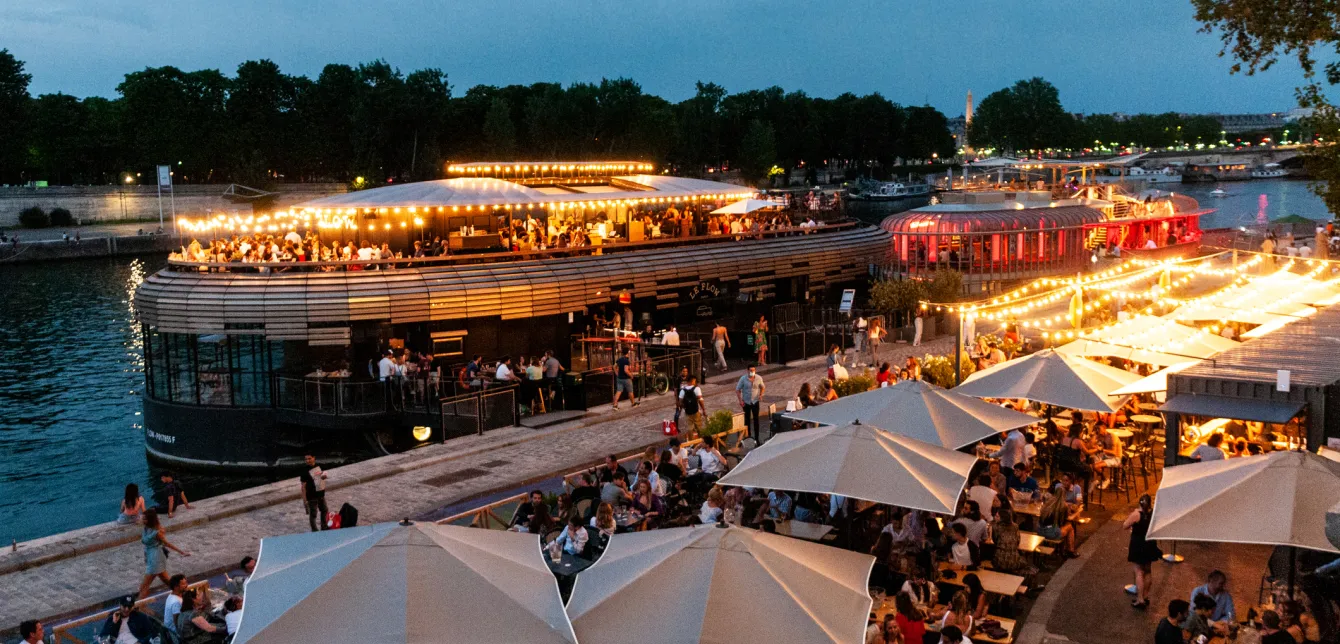 Les restaurants et hôtels aménagent leurs terrasses. Les toits (ou rooftops) offrent des points de vue inédits sur Paris et ses monuments emblématiques. L’esprit guinguette renaît au bord de l’eau et les friches. Tiers-lieux et autres lieux alternatifs font rimer fête et convivialité.