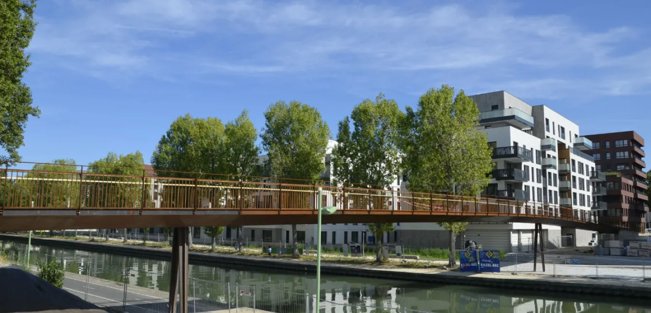 À la place des bâtiments industriels qui empêchaient l’accès au canal, un ensemble résidentiel de 600 logements avec des commerces est en train de voir le jour dans la ZAC quartier durable Plaine de l’Ourcq. La passerelle contribue à animer le quartier et à ouvrir la ville sur le canal de l’Ourcq, aux piétons et aux cyclistes, pour qu’ils profitent de la longue promenade aménagée sur les berges.