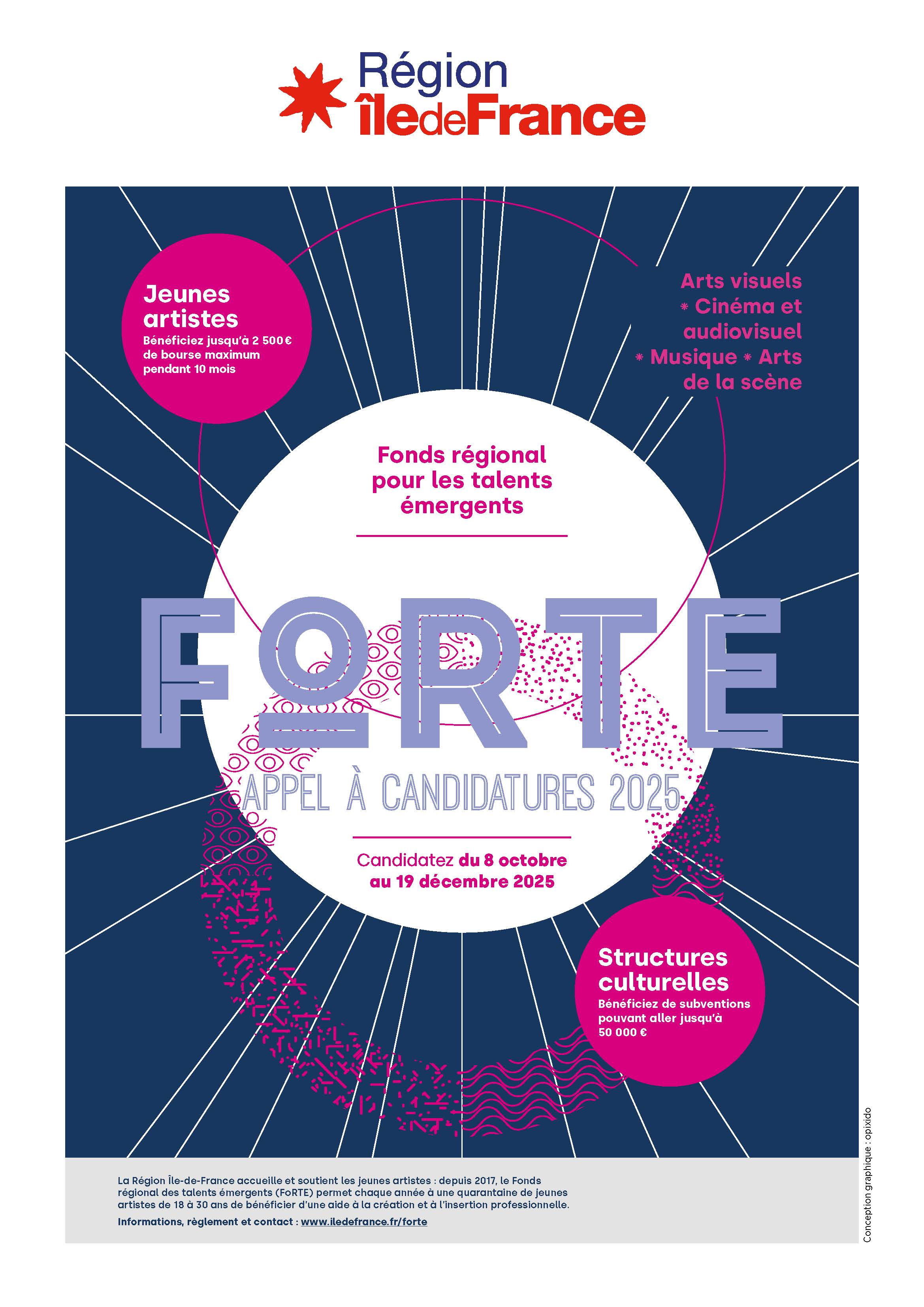 Lancé en 2017 par la Région pour soutenir les jeunes artistes d'Île-de-France, le Fonds régional pour les talents émergents (FoRTE) permet aux jeunes créateurs âgés de 18 à 30 ans de bénéficier d’une bourse de 2 500 euros par mois pour une durée maximale de 10 mois, pour réaliser leur première œuvre.