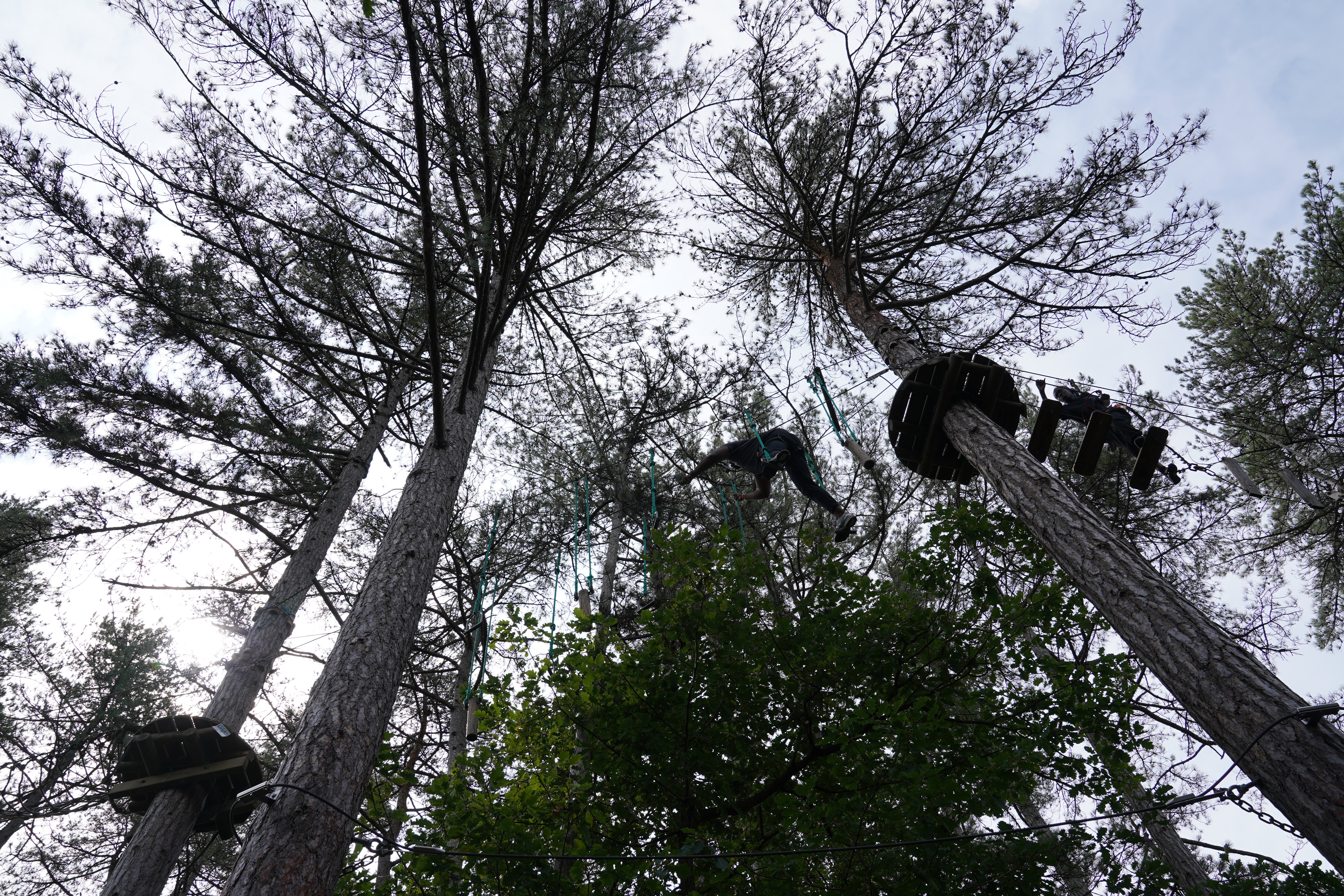 J’y vais : il faut jouer l’équilibriste tantôt sur un fil en fer, tantôt sur des planches en bois ; passer de pneu en pneu ou s’élancer dans le vide. Le parcours orange – difficulté moyenne – est ludique, mais je me demande à quoi ressemble le rouge : « Il faut un peu de force pour le rouge, mais pour ceux qui aiment la difficulté, c’est bien ».