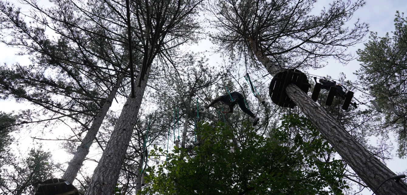 Je mets un pied sur le sol, on ne s’arrête pas là : direction l’accrobranche. Nous avançons un peu plus profondément dans la base, en pleine forêt de Fontainebleau. Les installations se fondent dans le décor. En chemin, nous longeons une immense piscine où des baigneurs profitent de l’eau, bercés par une ambiance qui donne un parfum de vacances. Soudain, au-dessus de nous, un bruit de câble : une femme glisse en tyrolienne.