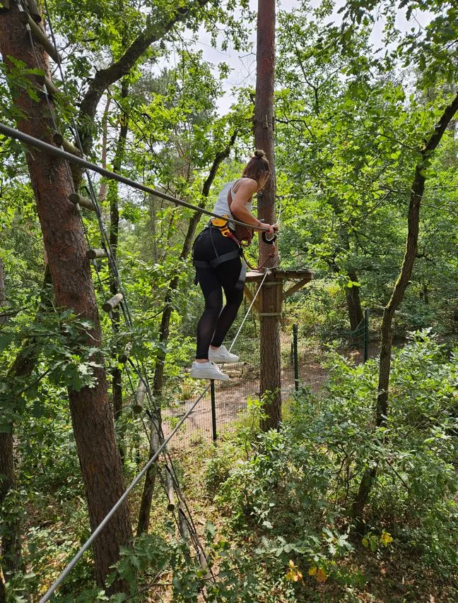 Nous approchons d’une cabane sur laquelle est inscrit « Parcours aventure ». Roxane m’équipe d’un baudrier et ajuste les sangles. « Dans ta main, tu as le crochet, qui doit rester attaché au câble, et la poulie pour la tyrolienne. Les règles sont simples : pas de bijoux, toujours rester accroché et attendre que la personne devant toi ait fini avant de s’élancer sur la tyrolienne. »