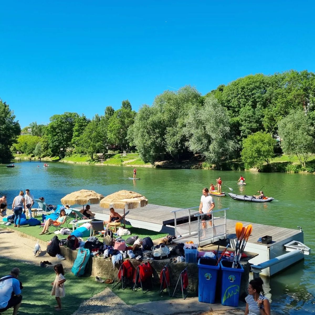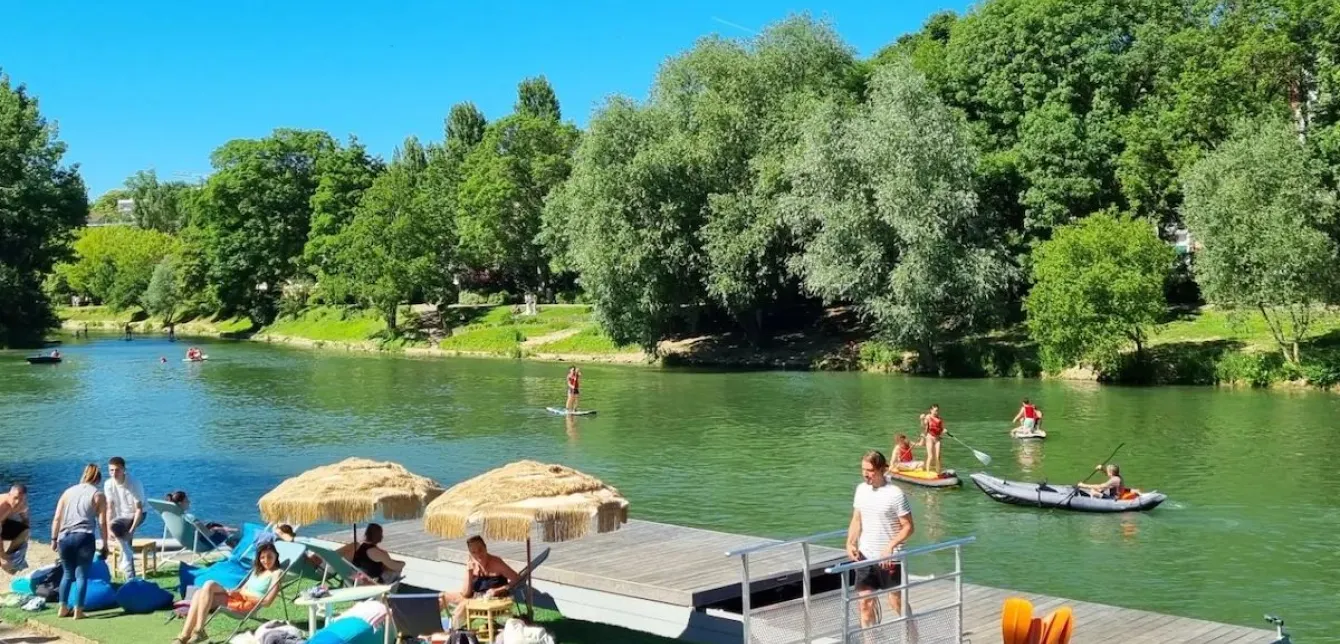 Une rivière (la plus longue de France avec ses 514 km), des saules pleureurs, une dizaine de transats, quelques parasols, une buvette dans une cabane en bois… Vous la sentez, cette sensation de vacances, entre odeur de crème solaire et cris d’enfants qui jouent au bord de l’eau ? Non, vous n’êtes pas dans le golfe du Morbihan mais à Saint-Maur-des-Fossés, dans le Val-de-Marne, à quelques minutes à pied de la gare du RER A de Champigny-sur-Marne (94).