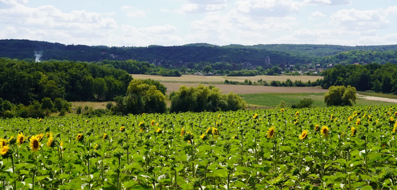 Je suis l’itinéraire indiqué par l’appli et quitte la petite cité pour m’enfoncer dans le Parc naturel régional Oise-Pays de France. La quiétude est totale et le paysage très verdoyant. Je traverse un village, puis une succession de bois et de prairies vallonnées. Bougeott dit vrai sur la richesse de la biodiversité. Je croise quelques chevaux, beaucoup de papillons et même des libellules. Les abeilles butinent les fleurs des champs qui bordent les sentiers et les centaines de tournesols qui s’épanouissent au soleil. Après un passage dans la forêt et une petite côte, l’horizon s’éclaircit pour offrir au promeneur un point de vue sur un paysage bucolique à souhait.