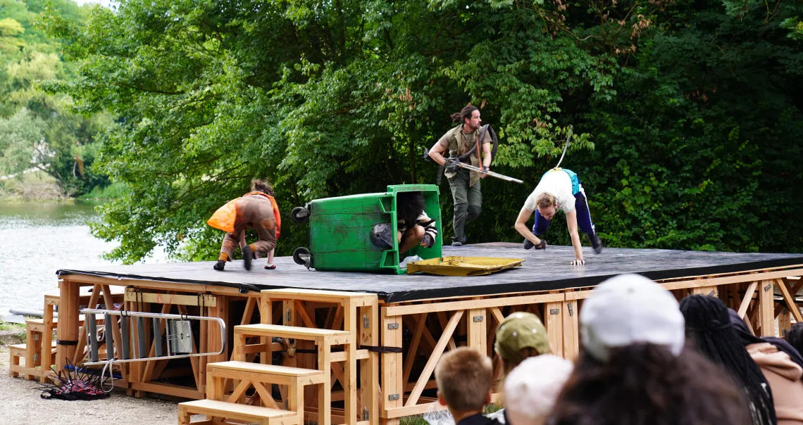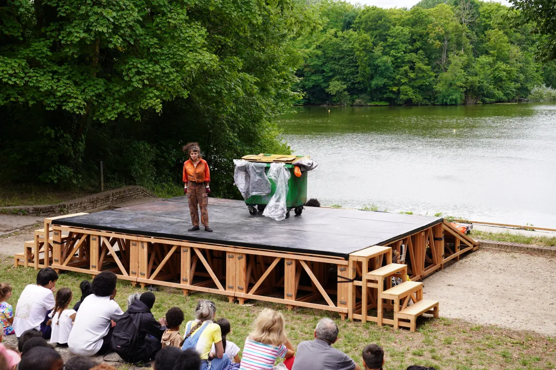 À 14 h, la prairie se vide ; direction une autre clairière du parc où une petite scène a été montée pour La Renarde. Cette comédie initiatique suit une renarde vivant dans une décharge et propulsée en forêt, où elle découvre l’impact de l’humain sur la nature.