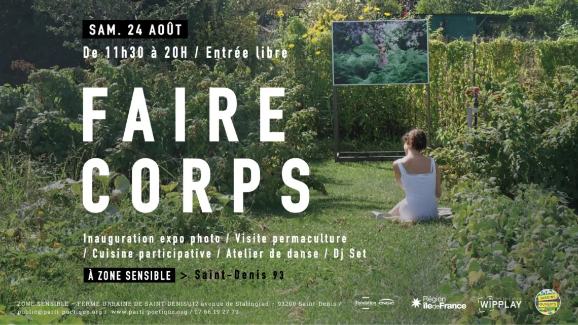 En écho à la thématique du concours photo organisé en partenariat avec la plateforme Wipplay, Zone Sensible proposera une programmation autour du corps. Cette année, les photographes ont été invités à mettre à l’honneur les représentations symboliques ou réelles du corps dans les espaces verts franciliens. L'exposition des 10 photos choisies par le jury sera inaugurée à l’occasion de la clôture de Jardins ouverts. Au programme également : visite guidée de la ferme en permaculture, atelier culinaire avec la cheffe Ranwa Stephan, atelier chorégraphique avec Aurélie Kepes du collectif Le Bruit qui court, puis Dj set de Sorana Doré.