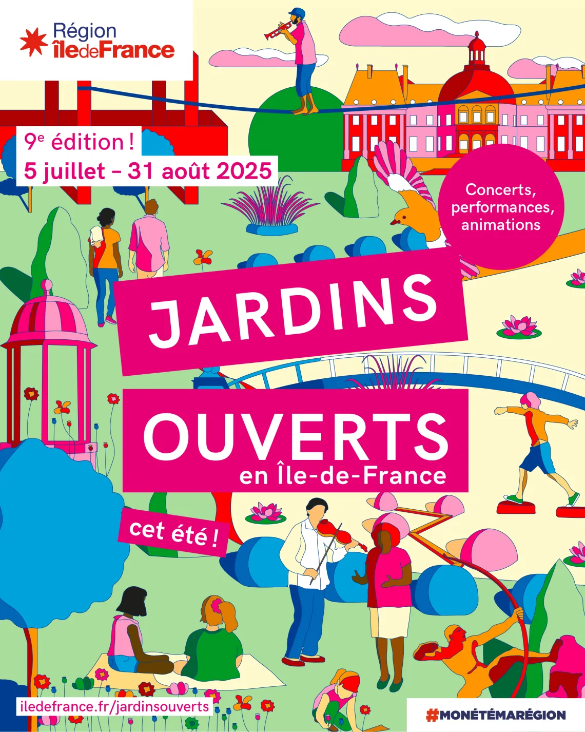 Dans le cadre de l'opération « Mon été, ma région », initiée par la Région Île-de-France, des centaines d’événements culturels, sportifs et éducatifs en Île-de-France sont programmés cet été, dont Jardins ouverts qui reviendra pour sa 9e édition, du 5 juillet au 31 août 2025.