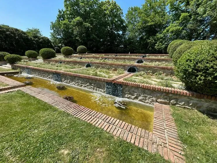 Ici, pas de parc classique : briques rouges, mosaïques, béton, buis et sous-bois s’harmonisent autour d’un élégant chemin d’eau, dans un style inspiré de la Méditerranée et des années 30.