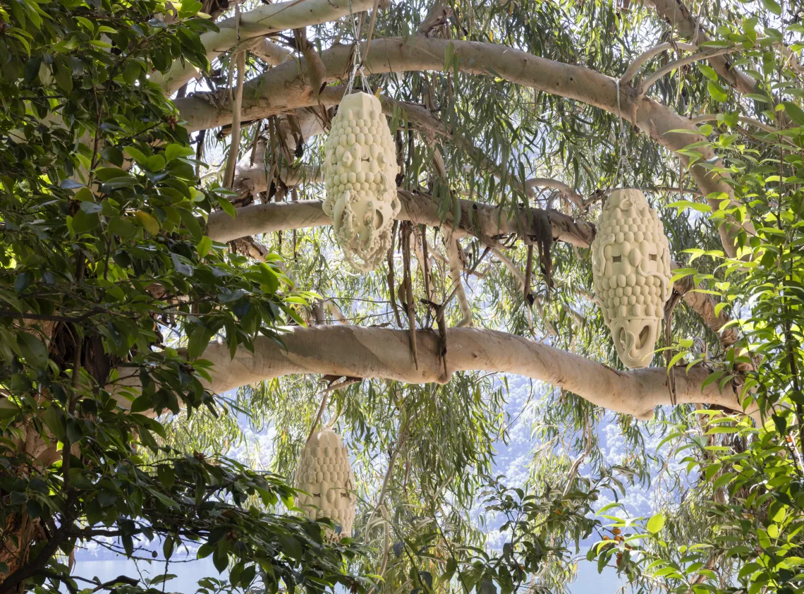 Raphaël Emine présentera son installation « Nests » composée de céramiques suspendues dans les arbres du parc de la Maison de Chateaubriand. Issues de ses recherches entomologiques, ces œuvres sont des assemblages d’architectures qui ciblent différentes espèces d’insectes et tentent des collaborations avec le vivant. Ces céramiques, que l’artiste crée en mêlant techniques traditionnelles de modelage et impression 3D d’argile, sont creusées de loges, galeries et tunnels et contiennent des apports organiques végétaux, destinés à favoriser la nidification des insectes. Leurs dessins baroques et biomorphiques rappellent l’architecture fantastique ou l’architecture utopique.