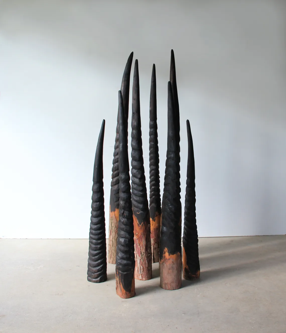 Au détour d’un chemin dans une clairière du parc, vous pourrez découvrir « La harde », une installation de la plasticienne Lélia Demoisy alliant animal et végétal, composée de cornes de gazelles sculptées dans des troncs.