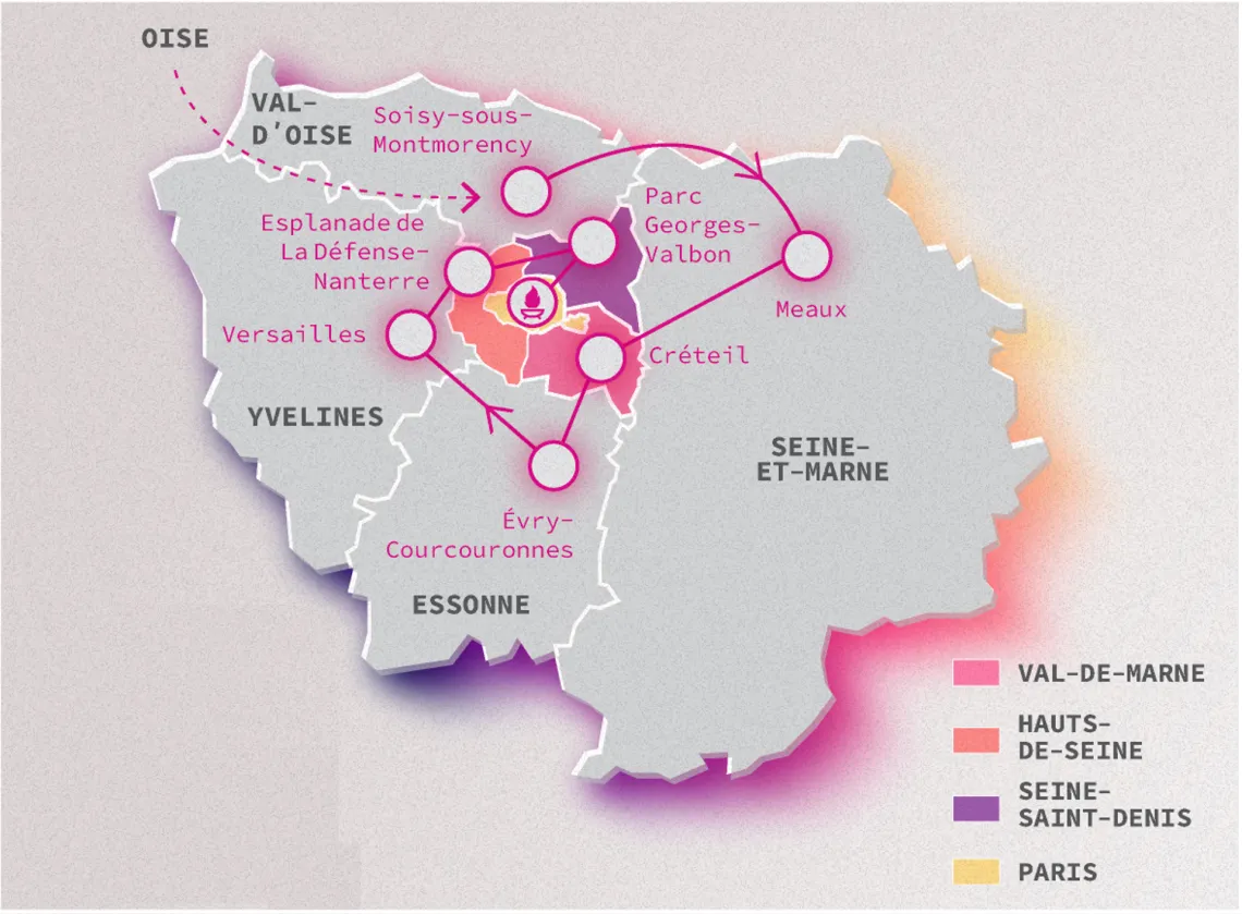 - Le 25 juillet 2024 en Seine-Saint-Denis : Pierrefitte-sur-Seine, Stains, La Courneuve (Parc Georges-Valbon), Aubervilliers, Pantin, Les Lilas, Bagnolet, Montreuil, Romainville, Neuilly-sur-Marne, Noisy-le-Grand, Drancy, Bobigny, Noisy-le-Sec, Bondy, Les Pavillons-sous-Bois, Aulnay-Sous-Bois, Livry-Gargan, Sevran et Tremblay-en-France.