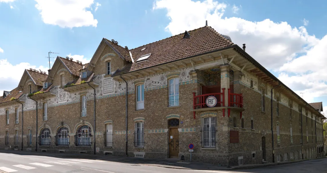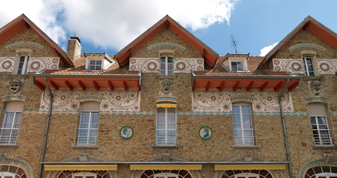 La maison est construite pour soixante pensionnaires. Les trois ailes sont réparties comme suit : l'aile ouest pour vingt femmes, l'aile est pour vingt hommes et le bâtiment central pour dix ménages. L'oeuvre majeure est sans doute le bâtiment de la maison elle-même : les murs sont construits en pierre meulière, très utilisée dans la région, laissée apparente et garnie aux joints de petites pierres colorées qui donnent un aspect lumineux à l'édifice par n'importe quel temps. A cela s'ajoutent d'autres décors et jeux de couleurs : sur l'aile centrale, deux grands médaillons de la frise représentent le coq, emblème du fondateur de la maison, et la chouette d'Athéna, déesse des arts d'Athènes, berceau du théâtre.