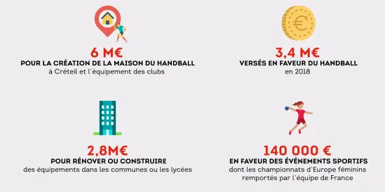 La Région a financé ce nouvel équipement, dont le coût total est de 40 millions d'euros, à hauteur de 6 millions d'euros. Cette subvention permettra d’équiper les clubs de l’ensemble du matériel permettant les pratiques, notamment des enfants (kits écoles, kits premiers pas, buts gonflables...). Pour les plus grands, l’objectif est d’œuvrer sur le sport santé avec des kits spécifiques. De plus, des opérations de découverte du handball à travers différentes animations sont mises en place sur les îles de loisirs régionales. Enfin, la Ligue continuera à mettre en place des actions auprès des jeunes en situation de handicap, notamment avec l’opération Hand’Ensemble.