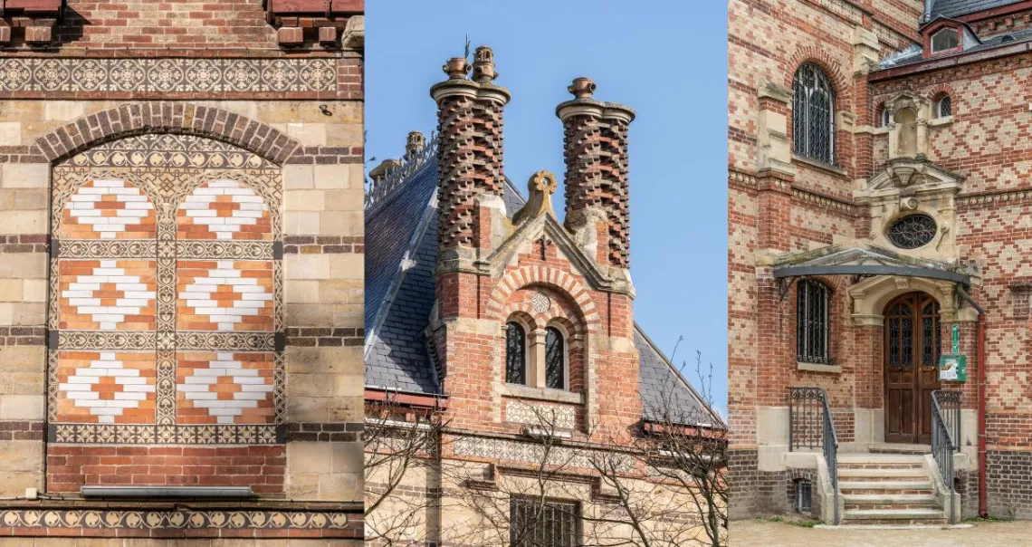 La villa se caractérise par la virtuosité de l'usage ornemental de la brique, qui s'exprime particulièrement bien dans les décors géométriques créés par les jeux de polychromie avec ce matériau. Les souches de cheminées amortissant pignons et lucarnes, toutes différentes et très décoratives, constituent un morceau de bravoure en même temps qu'une référence historique à l'architecture flamande.