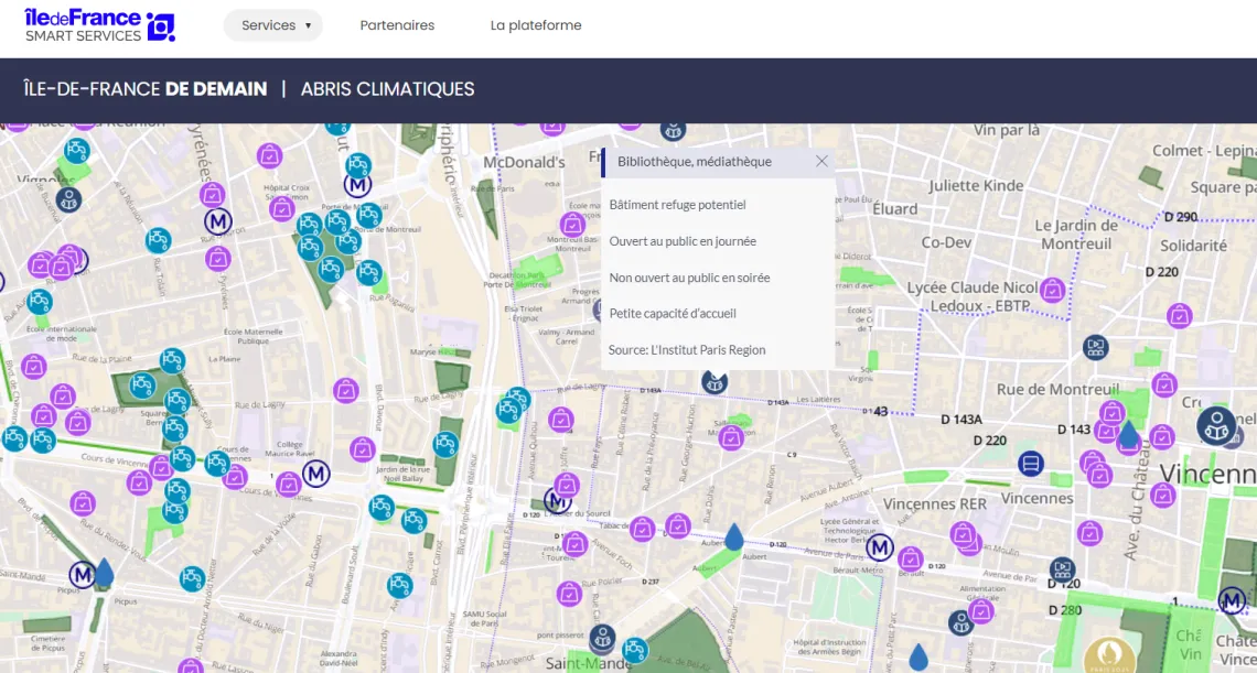 - Retrouvez les lieux pour rester au frais à Paris et en Île-de-France (bibliothèques, commerces, fontaines...) sur la carte du smart service « Abris climatiques » de la Région Île-de-France.