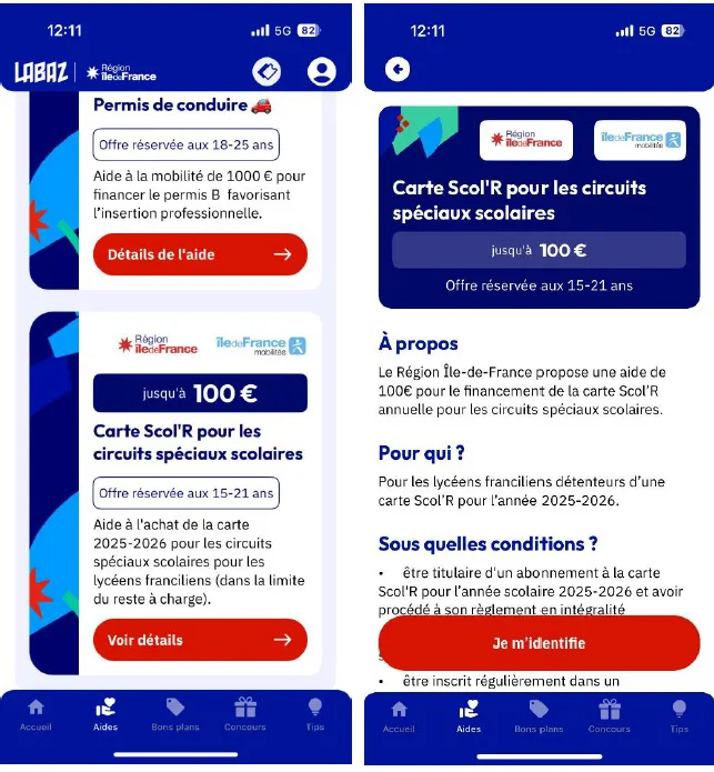 Aide transports La Région Île-de-France propose une aide de 100 euros aux lycéens qui, faute d'avoir des lignes de transports publics classiques à disposition, ont recours aux transports spéciaux scolaires pour se rendre dans leur établissement. Proposée sur l’appli LABAZ, cette aide, qui complète celle de 100 euros pour Navigo Imagine R, est à demander jusqu’au 30 juin 2026 pour l'année 2025-2026.