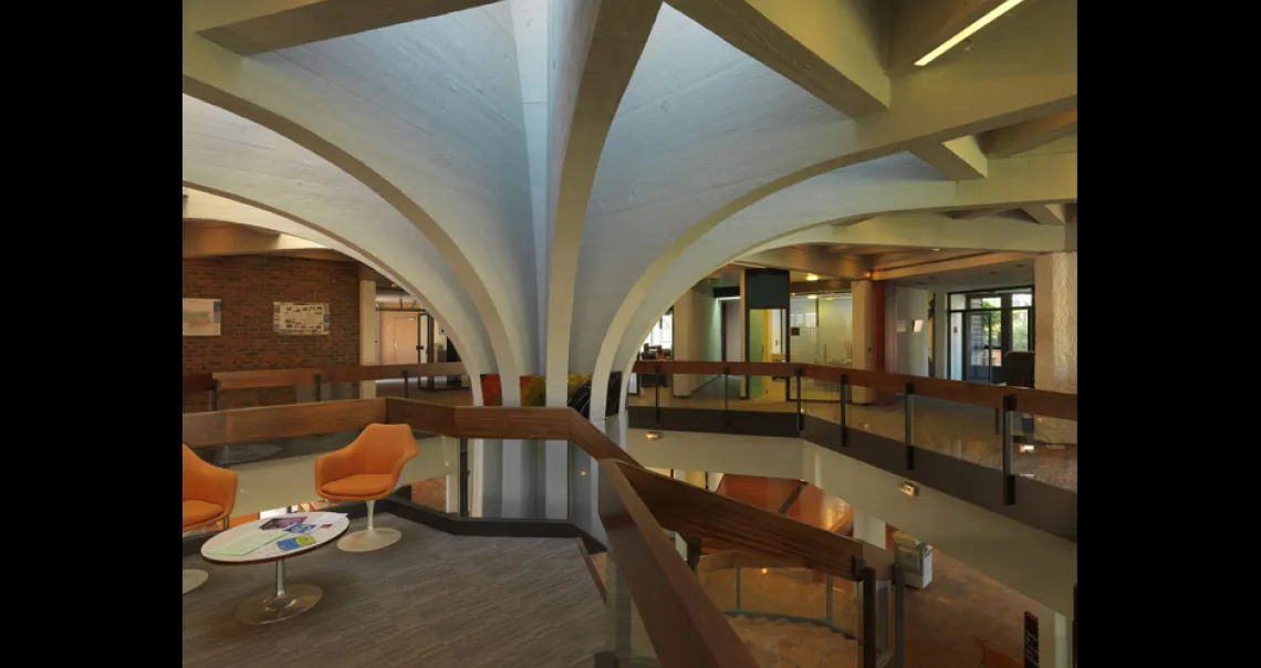 En 1972, le groupe Banque Populaire, en plein essor, décide d’ouvrir un centre national de formation pour tous les jeunes cadres ayant massivement rejoint l’entreprise. Le site de la ville nouvelle de Cergy est choisi en raison de sa future facilité d’accès et de l’emplacement exceptionnel proposé par la Mission d’aménagement, à proximité de la Préfecture et de son parc. La conception de l’édifice, qui doit refléter une pédagogie innovante axée sur le développement des échanges et de la personnalité des stagiaires, est confiée à l’architecte Ivan Seifert de l’Atelier d’Etudes Architecturales (ATEA). Son parti pris répond à un besoin d’espaces modulables de taille réduite, pour des enseignements dispensés en petits groupes de travail. Le chantier de construction s’achève en 1976. Depuis 1998, le bâtiment est devenu le siège de la Chambre de Métiers et de l’Artisanat du Val d’Oise.