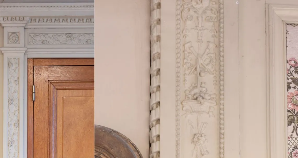 La maison du XVIIIe siècle, constituée de cinq travées, a été agrandie de chaque côté d’une travée, encadrée de bossages plats, qui étirent cette architecture tout en conservant son homogénéité. La distribution d’origine a été conservée à l’intérieur et témoigne, elle aussi, de la simplicité qui prévalait à la campagne. Nul besoin d’escalier d’apparat, le seul de la maison conduit aux chambres à coucher de l’étage, petites et nombreuses pour accueillir les amis en vacances. Les salons du rez-de-chaussée se succèdent et l’un d’eux a conservé tous ses décors de stucs et miroirs.