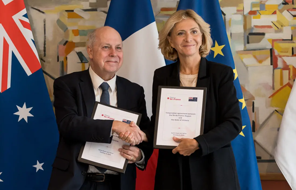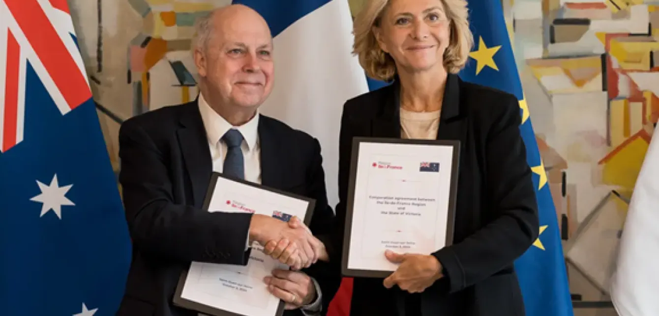 C'est au siège de la Région Île-de-France, à Saint-Ouen (93), que Valérie Pécresse, présidente de la Région Île-de-France, et Tim Pallas, Ministre de la Croissance économique de l’État australien du Victoria ont signé un accord de coopération le 2 octobre 2024.