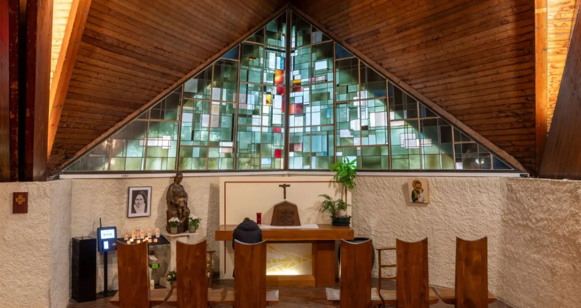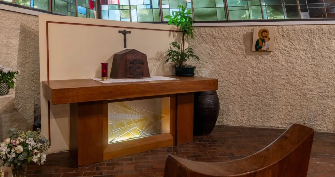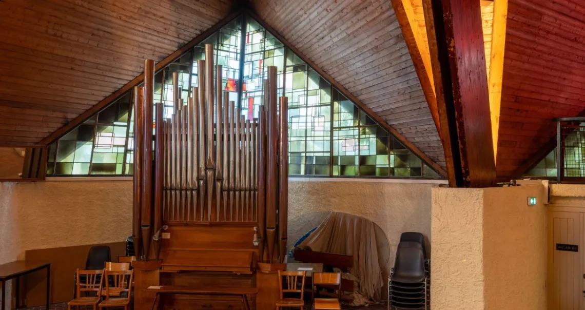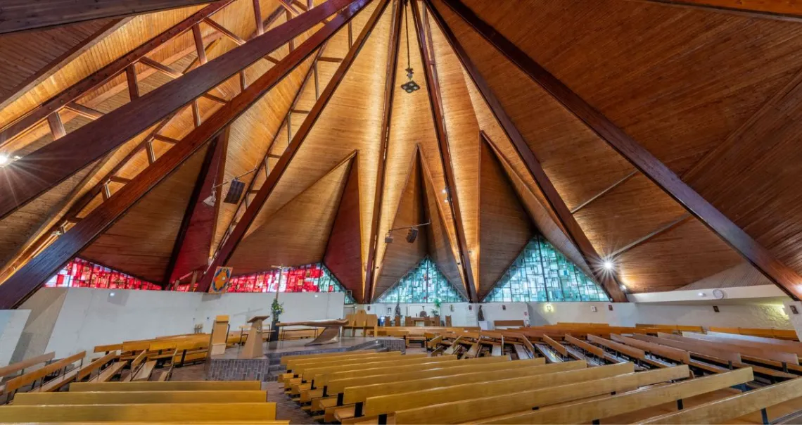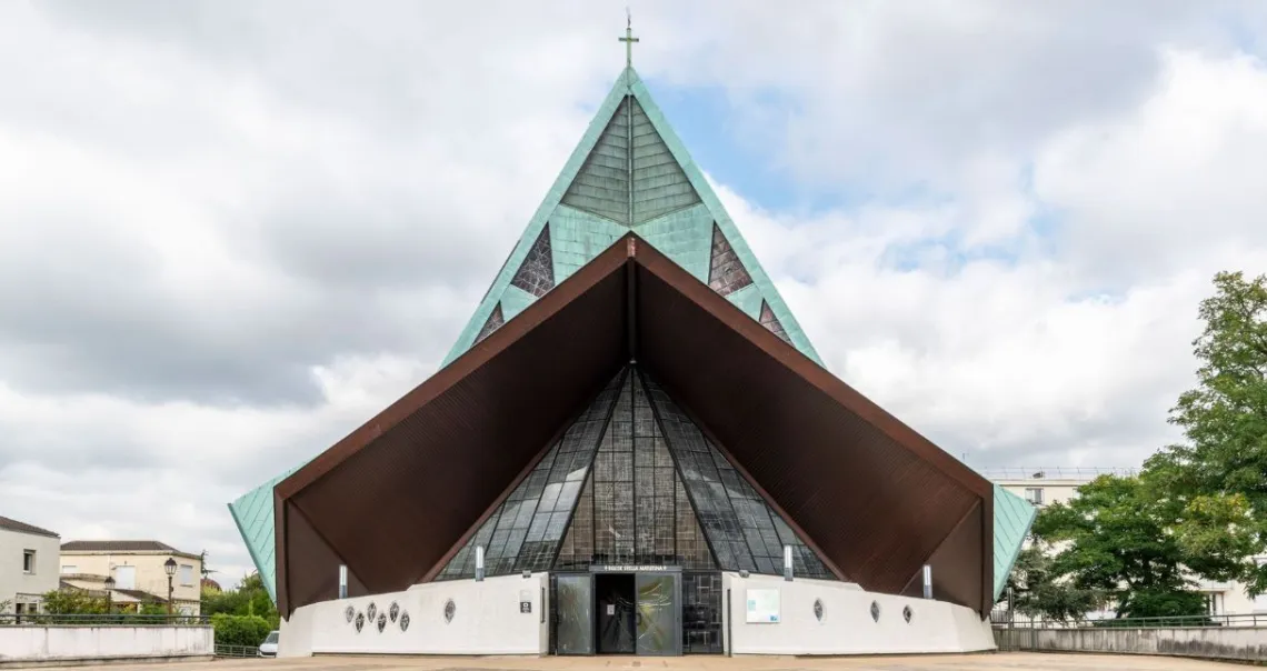 Le bâtiment se présente comme un polyèdre de bois posé sur 9 dés de béton enfoncés de 7 m dans le sol. La charpente en bois, composée de poutres en sapin de Norvège, a été réalisée par des Compagnons du Tour de France. La couverture est constituée de plaques de cuivre recouvrant les éléments de charpente formant une étoile à 5 branches. Le dessin de l'édifice, très complexe, laisse une large place aux verrières triangulaires qui illuminent la nef. Les vitraux occupent ainsi une surface de 423 m².