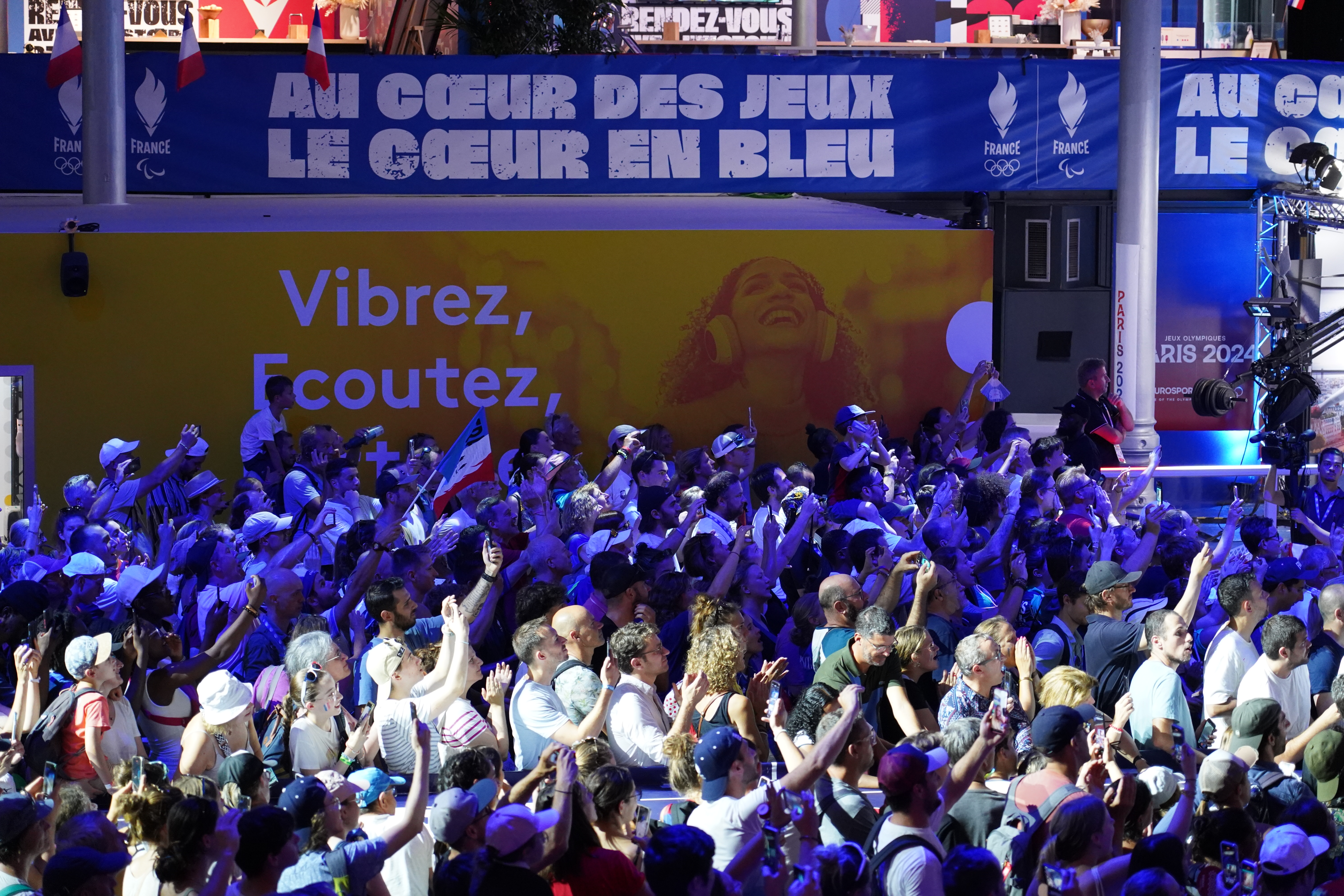 De la joie d’applaudir les médaillés et les qualifications en finale de Léon Marchand aux 200 mètres papillon et brasse, à la déception de ne pas voir Clarisse Agbégnénou couronnée. La judokate licenciée du Red Star Club de Champigny-sur-Marne (94) et tenante du titre, a dû se contenter du bronze. Pourtant, Hugo y croyait. Installé avec ses amis devant l’écran XXL de la fan zone du Club France, ce Parisien se réconforte avec la victoire des Bleues en escrime ; les 3 athlètes franciliennes viennent alors de se qualifier en finale de l’épée par équipe. Elles seront sacrées vice-championnes olympiques dans la soirée.
