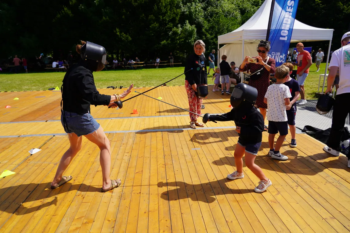L’escrime est le sport qui a remporté le plus grand nombre de médailles olympiques à la France avant le cyclisme. Le stand de la Fédération attire les foules. Guilhem, épéiste confirmé et volontaire, initie le public aux 3 armes de la discipline – le fleuret, le sabre et l’épée – et aux zones de touche. Sophie redécouvre ce sport qu’elle avait pratiqué à l’école, aux côtés de sa fille Joséphine : « On se sent très chanceuses de profiter de toutes ces activités qui sont très accessibles. On a aussi fait du VTT, du hockey et… du fitness ». Une séance géante avait en effet eu lieu sur la pelouse de La Villette ce matin-là et fait monter le cardio.