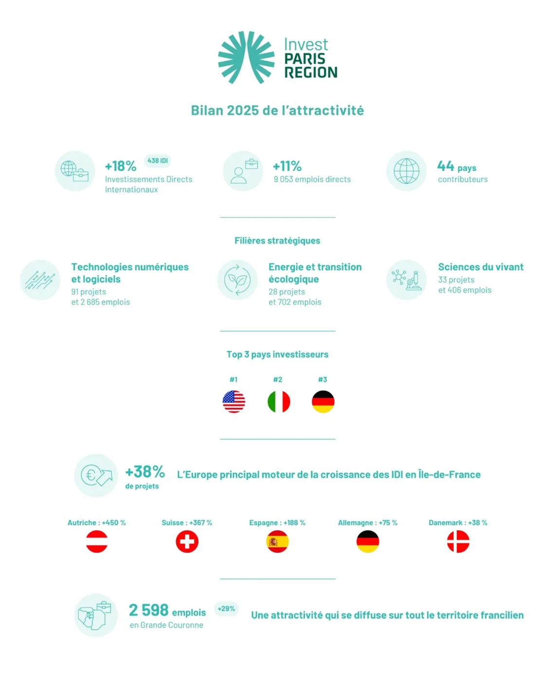 Investissement Dans un contexte mondial marqué par le ralentissement des investissements, l’Île-de-France fait figure d’exception. Avec une croissance à 2 chiffres du nombre de projets et d’emplois créés, un record de nouvelles implantations et une attractivité désormais portée par 44 pays, la région s'est imposée en 2025 comme le principal moteur européen de l’investissement international.