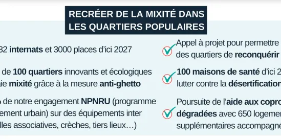 - Un Pacte pour les quartiers populaires en 3 axes – réussite, autorité et mixité –, il doit permettre de répondre durablement au cri d’alarme des élus et habitants des quartiers populaires et de proposer des solutions nouvelles pour reconstruire des quartiers où chacun puisse s’épanouir.
