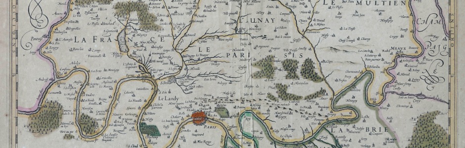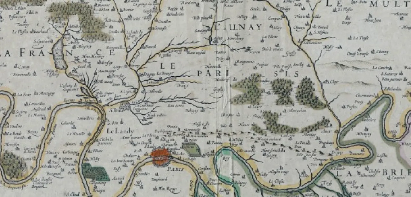 Telle est encore la configuration que lui donne, à la fin du XVIe siècle, la première carte un peu précise de L’Isle de France. Parisiensis agri descriptio (description de la campagne de Paris), dessinée par François de La Guillotière et parue en 1598 dans le Theatrum Orbis Terrarum d’Ortelius, puis reproduite dans de nombreux autres atlas. On peut mettre cette représentation cartographique en rapport avec la première définition que l’on ait de l’« isle de France », à lire dans La (sic) Guide des chemins de France, une description de l’ensemble du royaume publiée par Charles Estienne en 1552 :