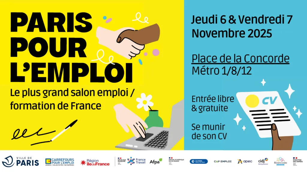 Si vous vous rendez à Paris pour l'emploi, ces 21 et 22 novembre 2024 à la Concorde, à Paris (8e), visitez le stand « Mon emploi après les Jeux en Île-de-France », animé par la Région.