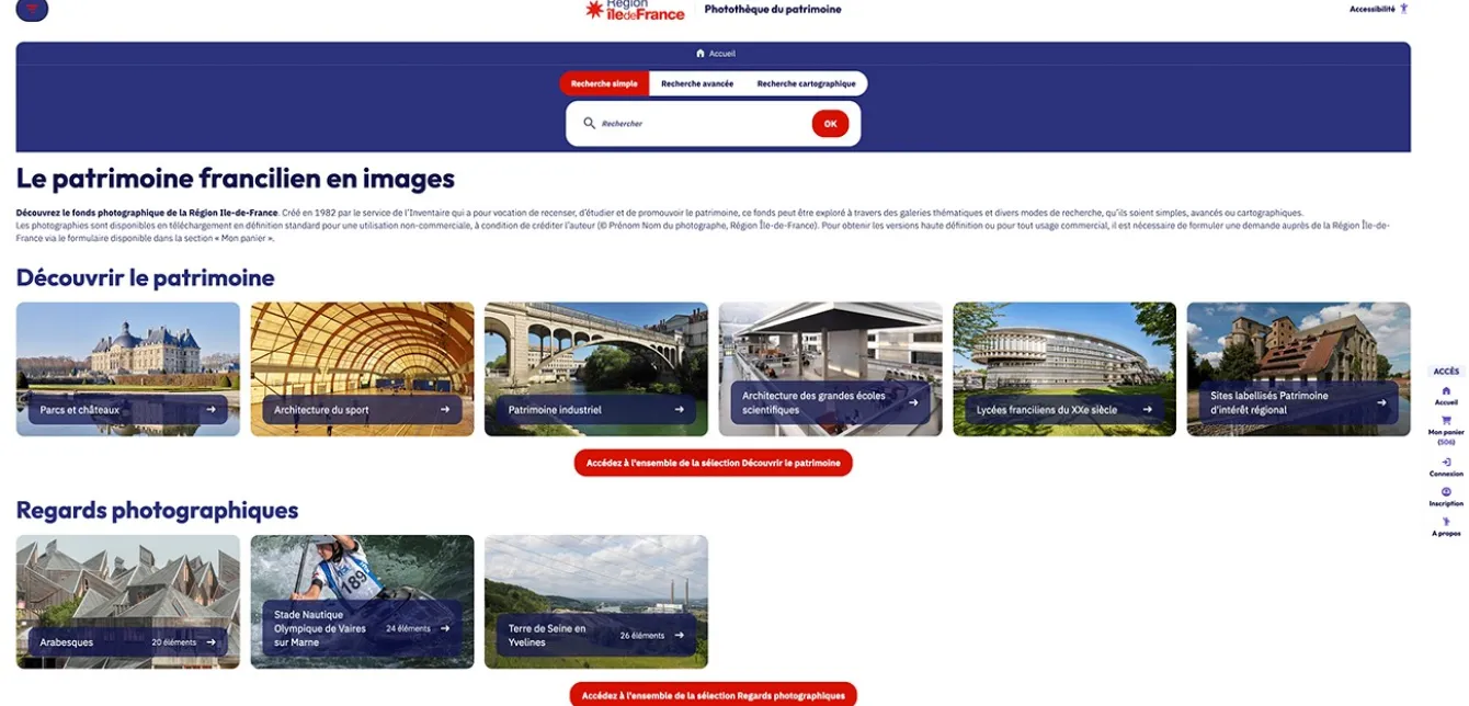 - Une rubrique « découverte du patrimoine » à travers plusieurs thématiques : parcs et châteaux, architecture du sport, patrimoine industriel, architecture des grandes écoles scientifiques, lycées franciliens du XXe siècle, sites labellisés « Patrimoine d’intérêt régional », théâtre et salles de spectacle, patrimoine religieux, ateliers et maisons d’artistes.