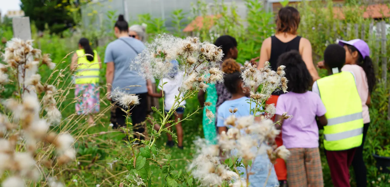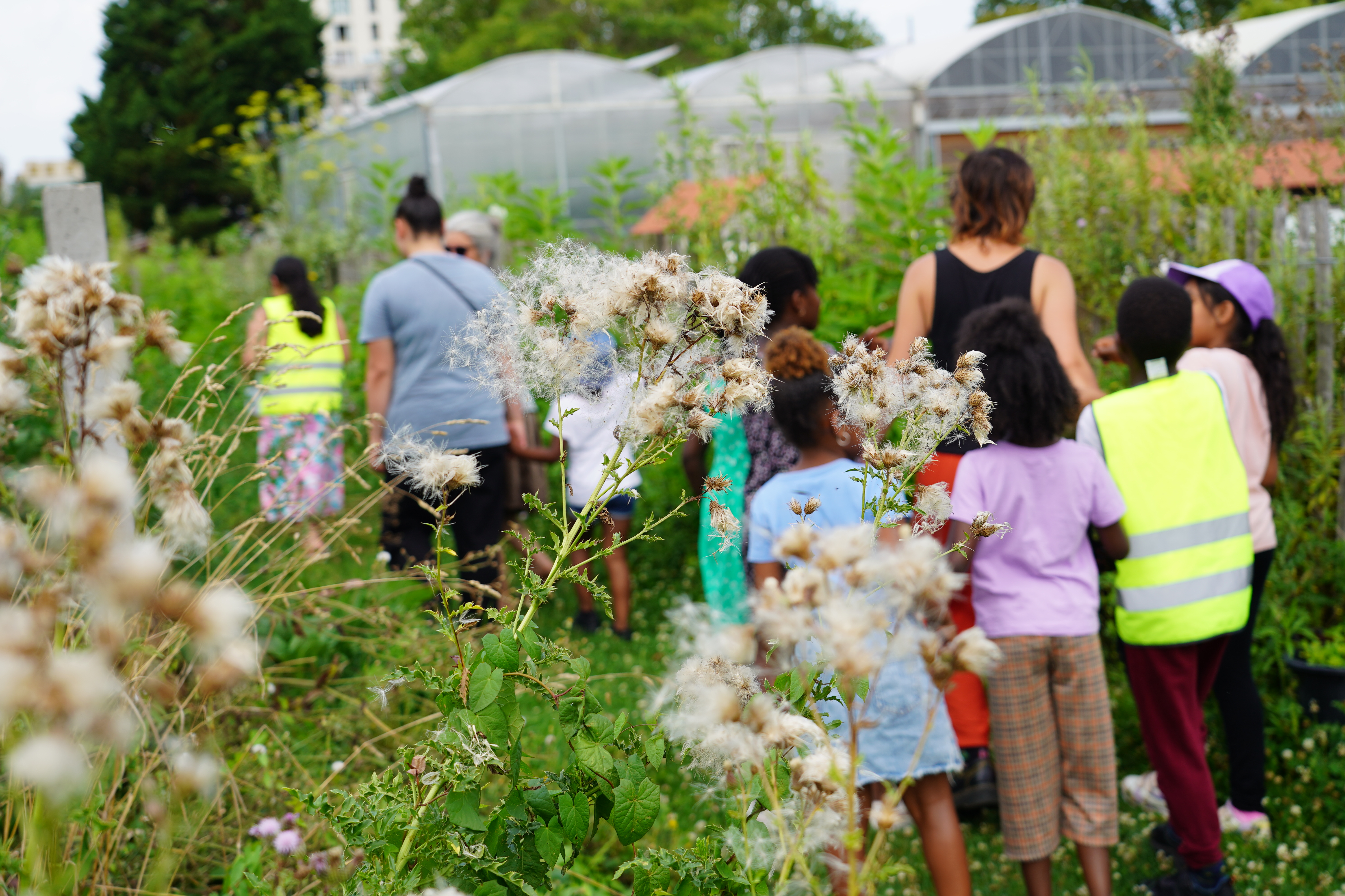 « Je viens de voir deux papillons », « j’ai goûté du chou kale, c’est très bon » ou encore « les tournesols, ce sont mes fleurs préférées » : les réactions des enfants fusent dans les allées du jardin qu’ils explorent cet après-midi-là. Venus du centre de loisirs Max Jacob de Stains (93), à quelques pas de la ferme, ils sont à la recherche de plantes dont ils pourront utiliser les pigments pour faire de la peinture.