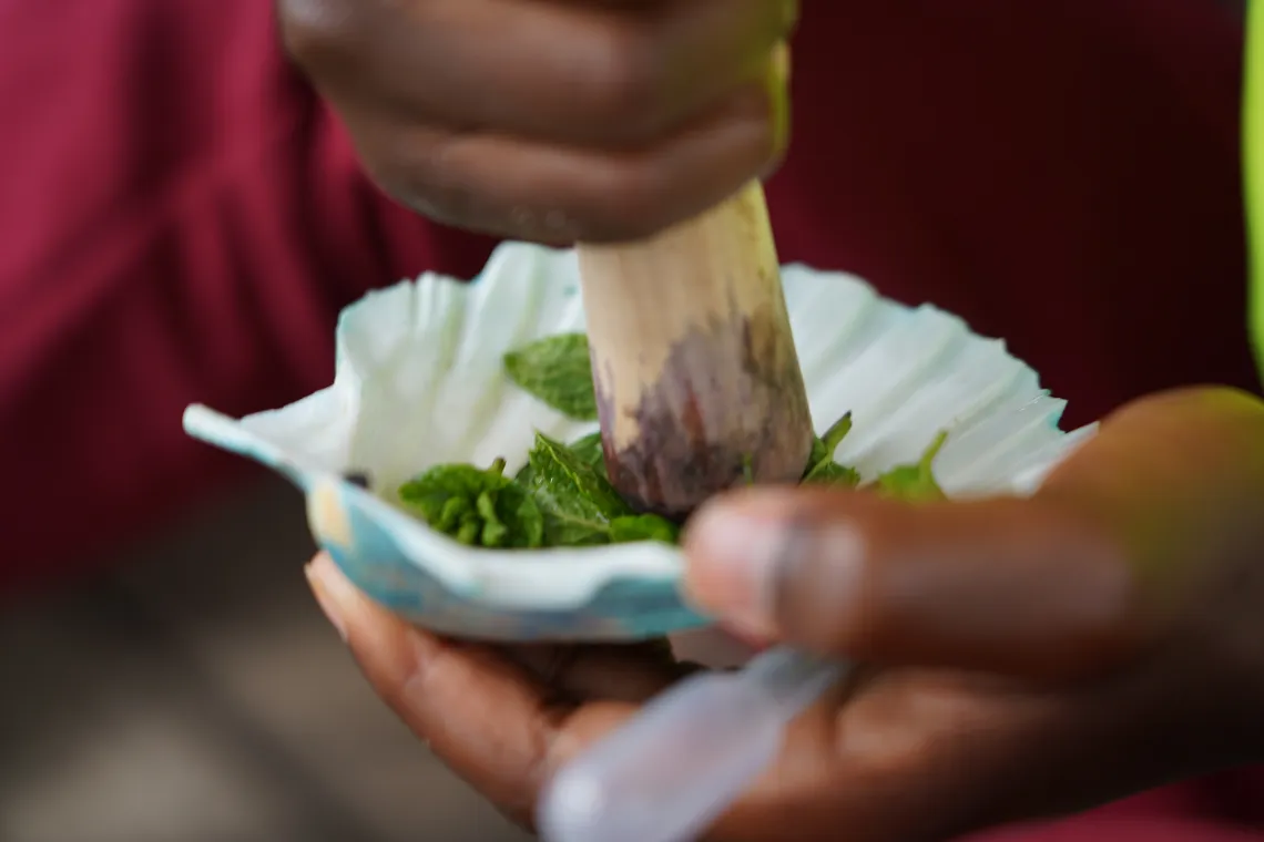 Une fois les plantes glanées, il faut en extraire la couleur. Les petits Franciliens s’en donnent à cœur joie avec leurs pilons. Pour obtenir la peinture végétale, il suffit ensuite d’ajouter un peu d’eau. Sevine s’exclame : « On va faire de l’art maintenant ». Layanha s’applique à tracer des fleurs à partir du vert obtenu grâce aux feuilles de menthe. « Je me sens joyeuse d’être ici et de faire cette activité », raconte-t-elle concentrée sur son dessin.