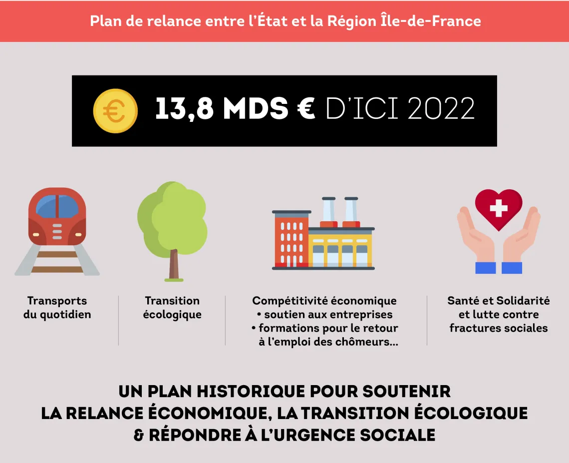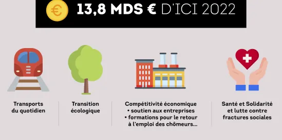 Afin de répondre aux nombreux défis économiques, sociaux, sanitaires et écologiques actuels, l'État et la Région ont signé, ce 4 mars 2021, un Plan de relance de 13,8 milliards d'euros pour 2021 et 2022, qu'ils financent à parts quasi égales.