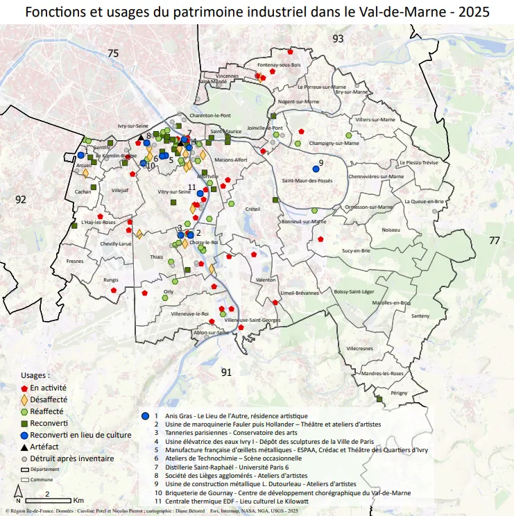 Après un bref bilan des protections légales (on en compte une dizaine), le propos insiste sur les reconversions à de nouveaux usages. Les plus structurantes ont, en leur temps, fait la une de la presse : on songe à la Manufacture des Œillets reconvertie en Théâtre des Quartiers d’Ivry, et à la briqueterie de Gournay devenue Centre de développement chorégraphique du Val-de-Marne. Prestigieuses ou modestes, toutes contribuent désormais à la lisibilité historique du territoire et à son rayonnement.