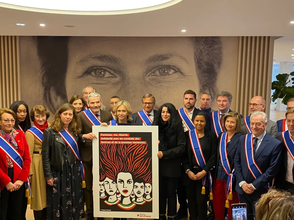 Aux côtés de Valérie Pécresse, présidente de la Région Île-de-France, étaient présents l’artiste franco-iranienne Marjane Satrapi, des conseillers régionaux, des maires franciliens et des représentantes d’associations de femmes iraniennes.