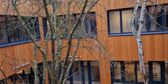 Afin de préserver les arbres présents sur le site du chantier, certains d’entre eux ont été intégrés aux patios du bâtiment, de telle sorte qu’ils font aujourd’hui partie du décor.