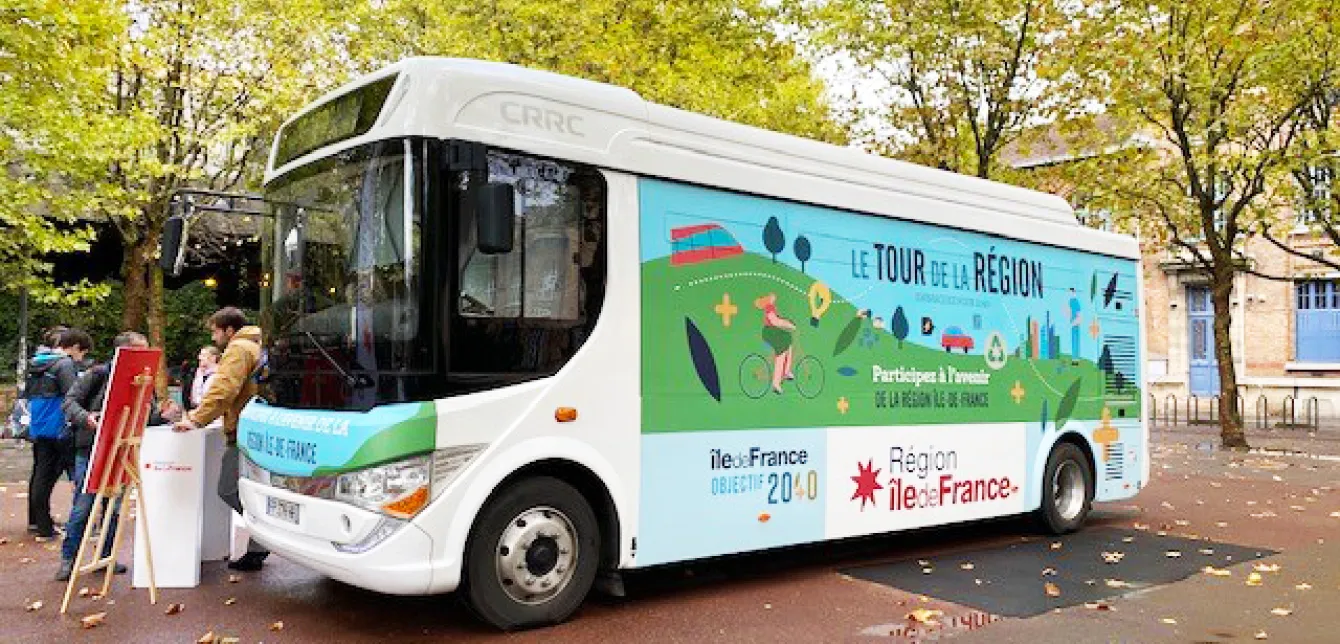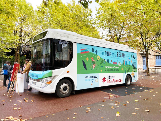 Lundi 26 septembre 2022, le bus électrique habillé aux couleurs du SDRIF-E a démarré sa tournée devant la mairie de Saint-Ouen (93), à 2 pas du siège de la Région Île-de-France. Une cinquantaine d'arrêts sont prévus.