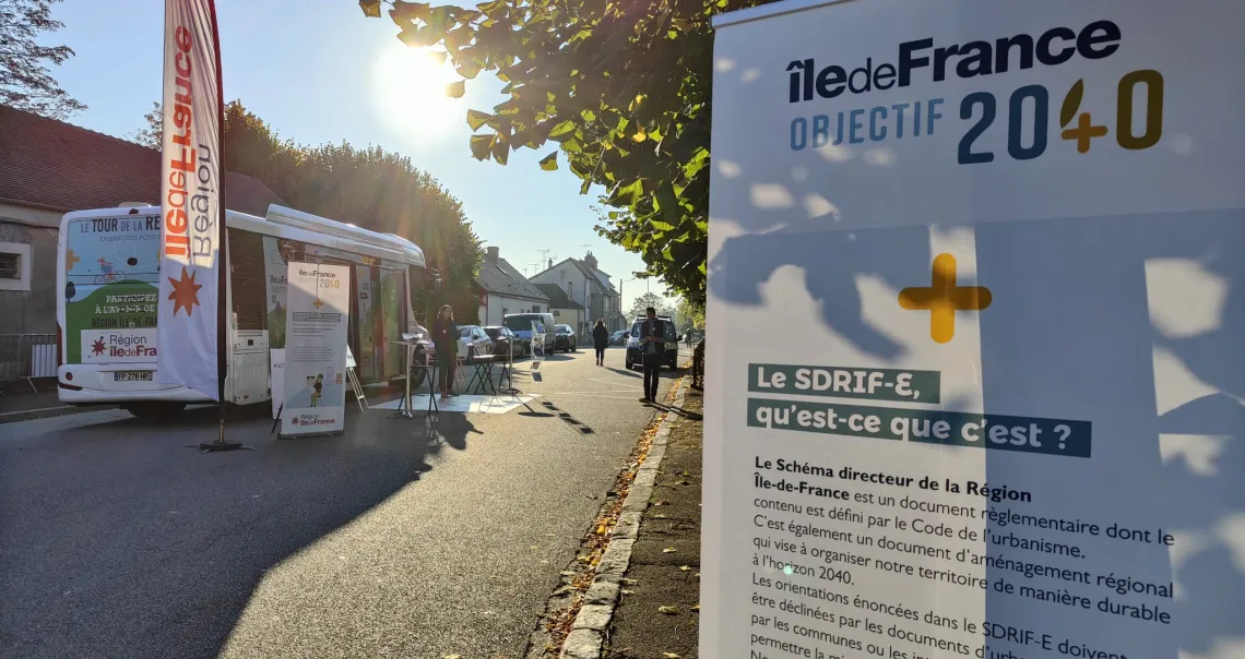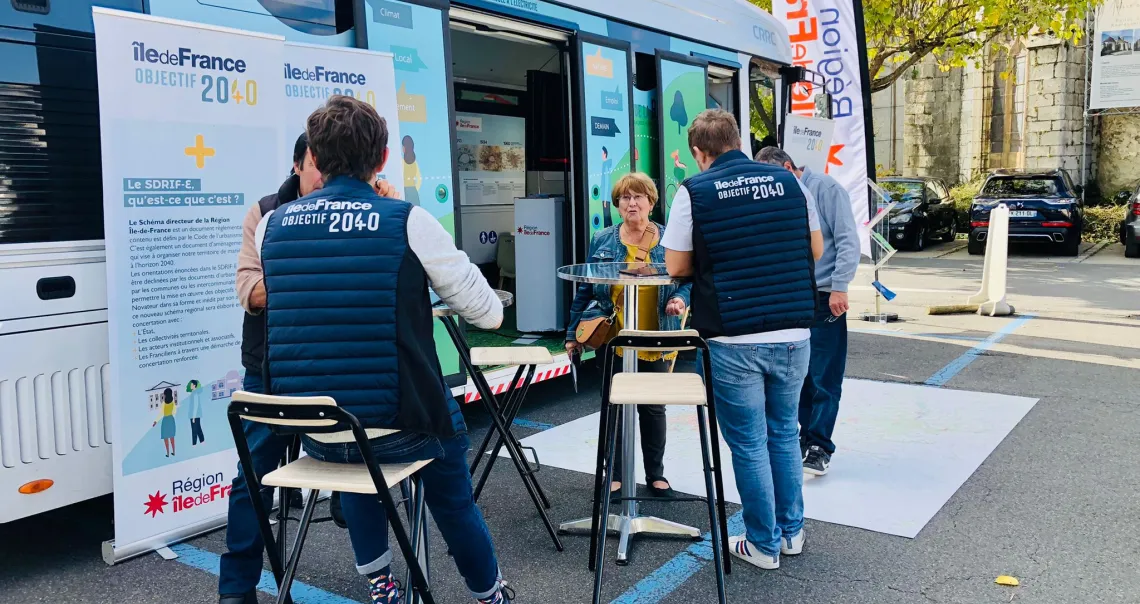 Île-de-France Objectif 2040 De fin septembre à novembre 2022, les médiateurs du SDRIF-E sillonnent tous les départements d'Île-de-France. Leur objectif : aller à la rencontre de ceux qui vivent et travaillent en Île-de-France pour les sensibiliser aux enjeux du nouveau projet d'aménagement durable et les inviter à participer à la phase de concertation. Environ 50 rencontres de proximité prévues.