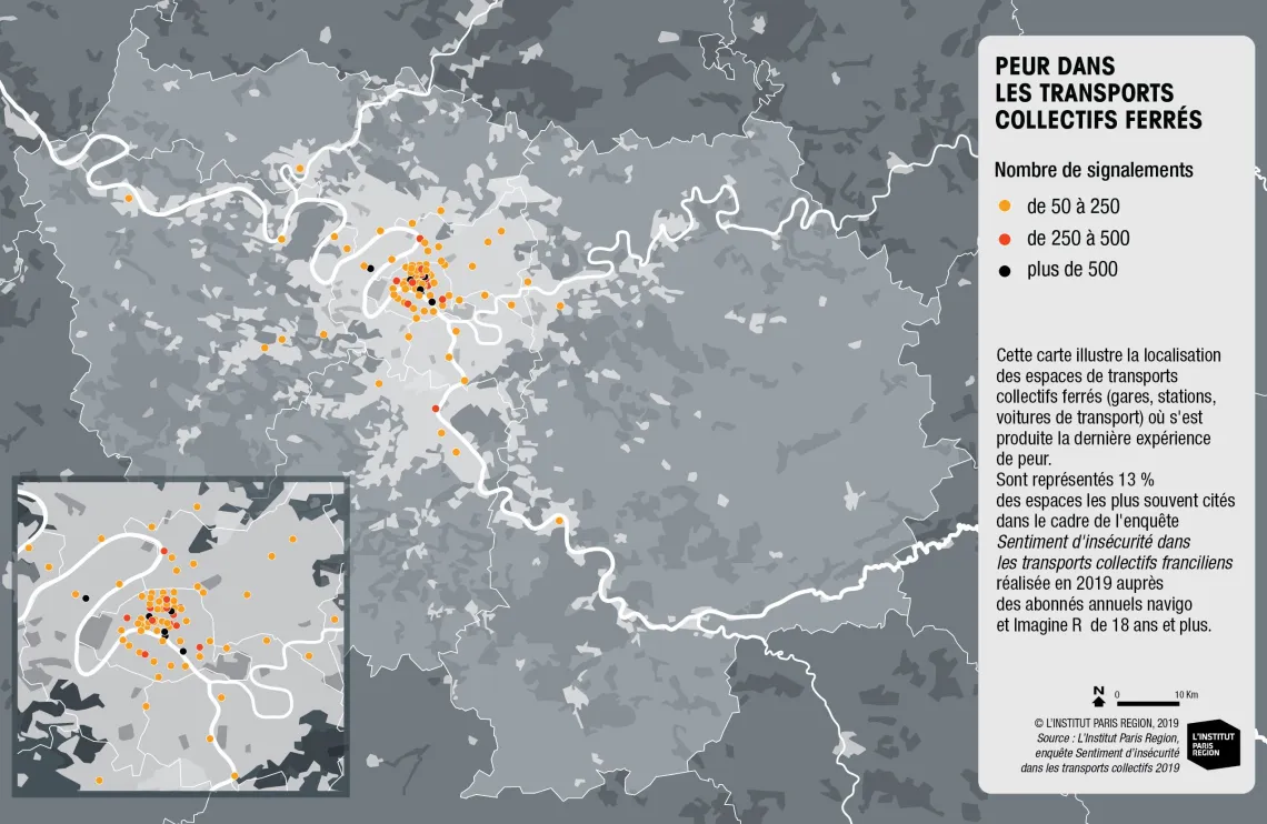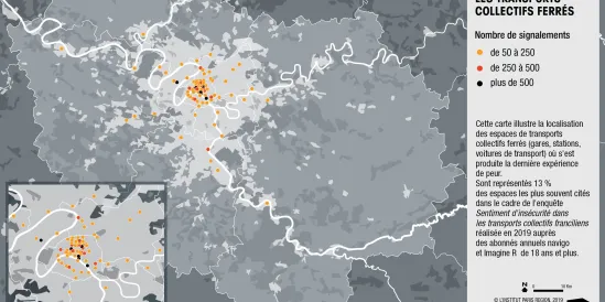 À la demande de la Région Île-de-France, l’Institut Paris Region a lancé, fin septembre 2019, une enquête inédite sur le sentiment d’insécurité des Franciliens dans les transports en commun, en partenariat avec Île-de-France Mobilités. 50.222 abonnés du passe Navigo annuel et Imagine R y ont répondu. Les résultats seront publiés au printemps 2020, mais les premiers éléments d’analyse font apparaître qu’environ 700 points du réseau de transport collectif ferré sont perçus comme particulièrement anxiogènes. En données brutes, c’est-à-dire sans tenir compte de l’intensité de fréquentation, la gare du Nord est le lieu le plus cité avec 1.565 signalements de peur, tous réseaux confondus.