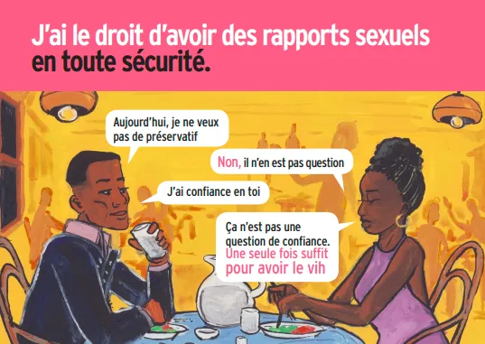 B.R : Il s’agit d’un outil qui contribue à accroître l’autonomie et le pouvoir d’agir des femmes originaires d’Afrique subsaharienne. Il a la forme de cartes postales présentant différentes saynètes dialoguées de la vie quotidienne. Ces cartes sont attractives et esthétiques. Elles visent à renforcer les comportements favorables à la santé sexuelle, les connaissances en matière de droits et la capacité d’agir grâce à l’identification de lieux ressources. Les cartes peuvent êtres lues par les femmes mais elles sont avant tout conçues comme un outil de prévention, un support d’échange entre pairs. Nous souhaitons animer des groupes de parole dans différents lieux et former des acteurs de terrain souhaitant utiliser l’outil à leur tour.