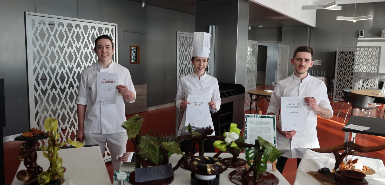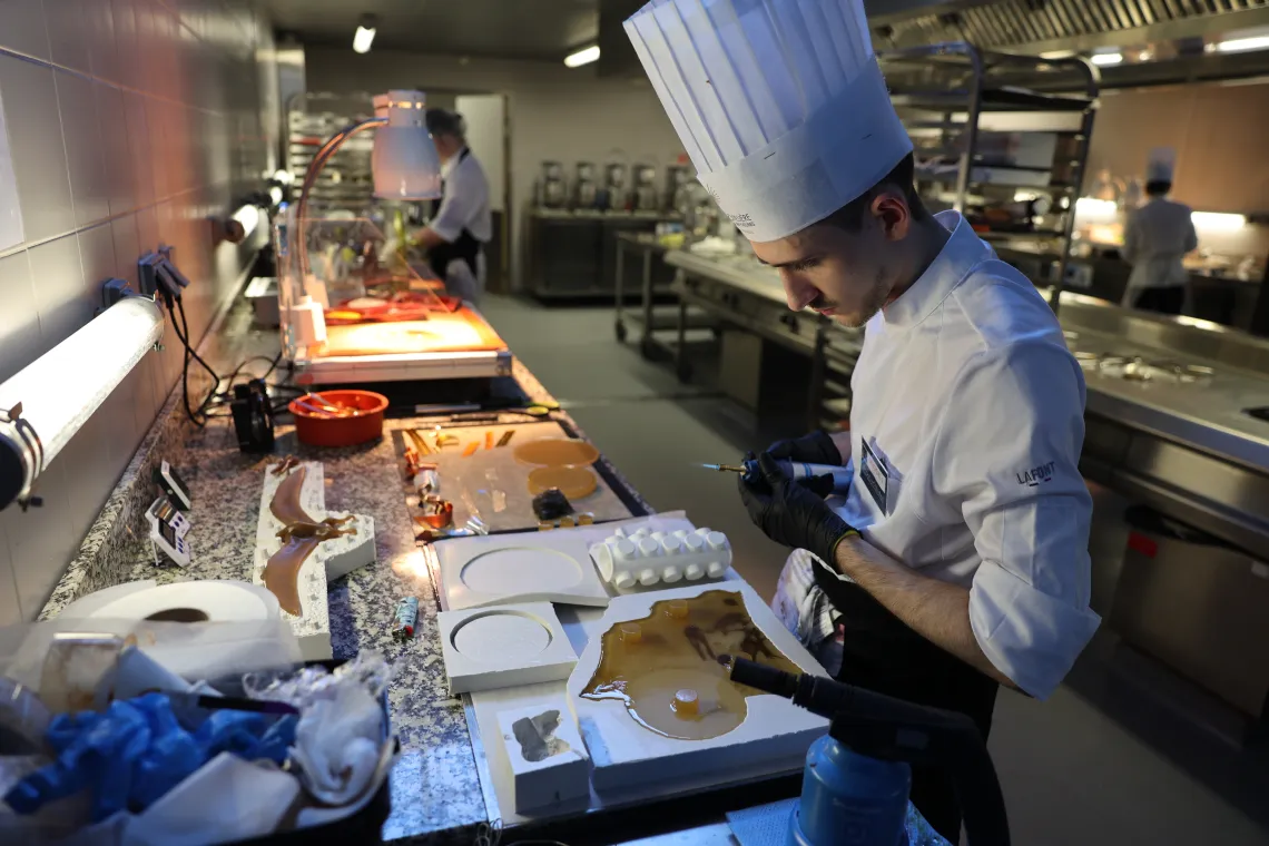 Lundi 20 février à 7h30, dans les cuisines du lycée hôtelier de Guyancourt (78), les 3 participants franciliens à la finale régionale des trophées Worldskills 2023 sont concentrés sur l'épreuve qui va bientôt commencer. Venus avec leur propre matériel, ils ont organisé leur espace de travail avec le plus grand soin. Chaque ustensile doit être à sa place, car chaque minute va compter. Aucun détail n'a été négligé. Flavie, la seule concurrente féminine a même apporté son propre four.