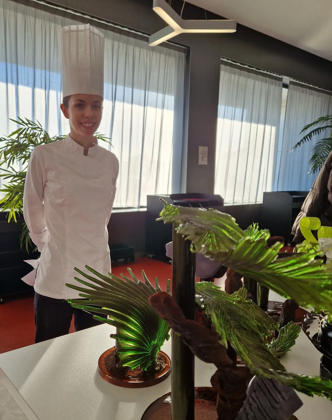 À 8h le compte à rebours est lancé. Dès cet instant, les candidats ont 6 heures et pas une minute de plus pour réaliser un entremet au chocolat, 6 florentins aux amandes glacées au chocolat et un présentoir en sucre d’art sur le thème du Jurassique.